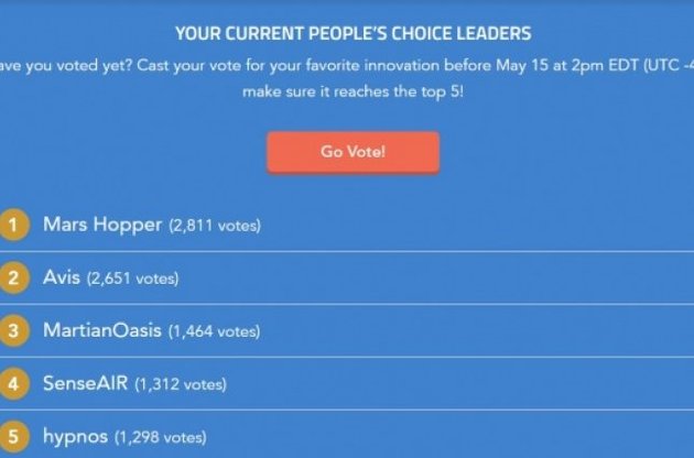 Проект Mars Hopper занимает первое место с результатом более 2,8 тысяч голосов. Вместе с тем, разрыв с командой из Македонии, которая изобрела "умный" браслет Avis для управления дронами, составляет всего 150 голосов.