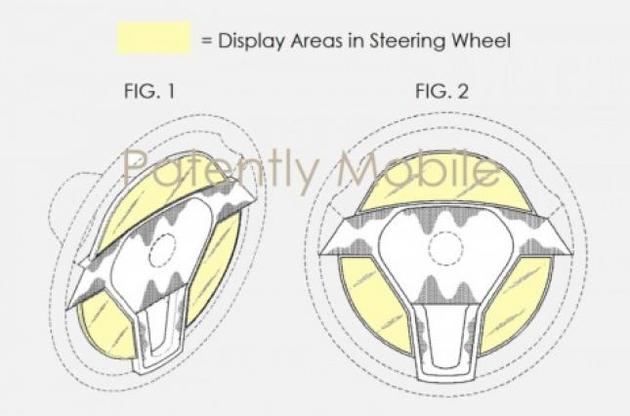 В первом патенте показан дизайн автомобильного руля со встроенными дисплеями. На них может отображаться полезная информация о состоянии автомобиля и прочем.