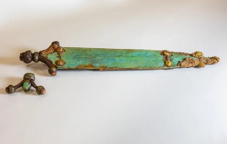 Он короткий, роскошно украшенный. Сохранился в ножнах, приспособленных для ношения на поясе. Рукоятка и передняя пластина ножен изготовлены из медных сплавов, покрытые волютами – спиралевидными завитками с «глазком» в центре. Ножны богато декорированы, а также инкрустированы камнями-кабошонами. По крайней мере, два из них имеют узоры в виде свастики. Для их изготовления, вероятно, использовали стеклянную пасту, говорится в недавно опубликованном археологическом отчете.