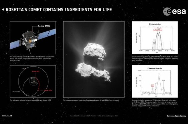 Зонд Rosetta обнаружил на комете Чурюмова-Герасименко компоненты, которые, по мнению ученых, сыграли ключевую роль в появлении жизни на Земле. Информация об этом была опубликована на сайте Европейского космического агентства.