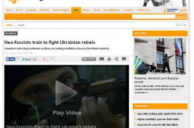 В одном из своих сюжетов телеканал "Альд-Джазира" в духе российских СМИ назвал бойцов добровольческого батальона "Азов" "неофашистами" и "сторонниками идей национал-социализма", а боевиков - "ополченцами".