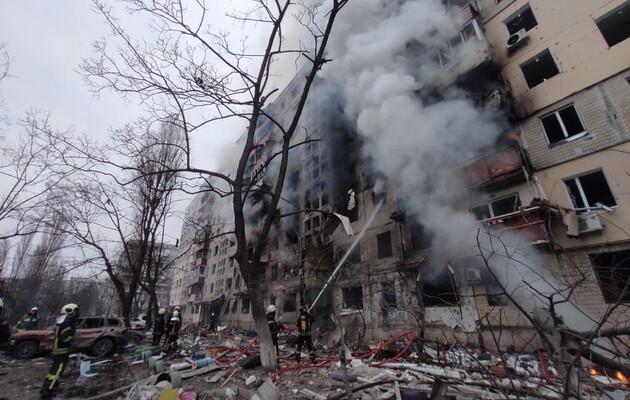 В девятиэтажке на столичной Оболони попал российский снаряд. В результате произошел обвал с 1 по 3 этажа, загорелись квартиры на 3 и 4 этажах. Погиб один человек.
