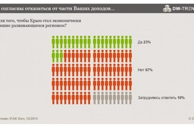 Более половины россиян (67%) не согласна отказаться от части своих доходов ради увеличения экономической поддержи Крыма. Таковы результаты репрезентативного опроса DW-Trend, который по заказу Deutsche Welle провело киевское отделение Института изучения общественного мнения IFAK.