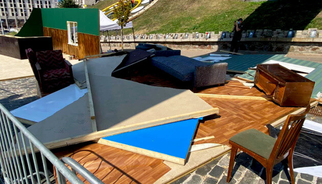 Установленные на Аллее Героев Небесной Сотни в Киеве декорации к празднованию 30-летия Дня Независимости Украины, которые возвели напротив портретов погибших во время Революции Достоинства активистов, начали демонтировать около десяти мужчин в рабочей форме компании Rentcity, которая занимается созданием декораций, передает «Укринформ».