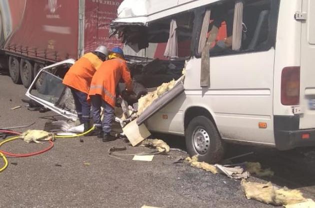 В Житомирской области на 127 км автодороги Киев-Чоп 20 июля произошло столкновение маршрутного автобуса и грузовика, в результате которого погибли десять человек, еще десятеро госпитализированы с разными травмами.