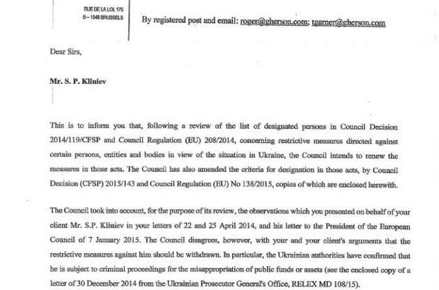 В письме говорится о том, что Совет ЕС намерен оставить в действии санкции в отношении Сергея Клюева с формулировкой о незаконном присвоении государственных средств и использовании служебного положения с целью получения неправомерной выгоды для себя или третьих лиц, сообщает РБК-Украина.