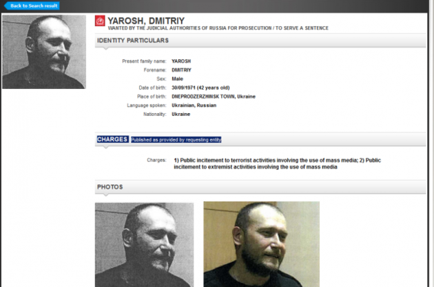 Инициатором розыска Яроша значится российская сторона. Цель розыска - уголовное преследование/отбывание наказания за "публичное подстрекательство к террористической деятельности, связанных с использованием средств массовой информации" и за "публичное подстрекательство к экстремистской деятельности, связанной с использованием средств массовой информации".