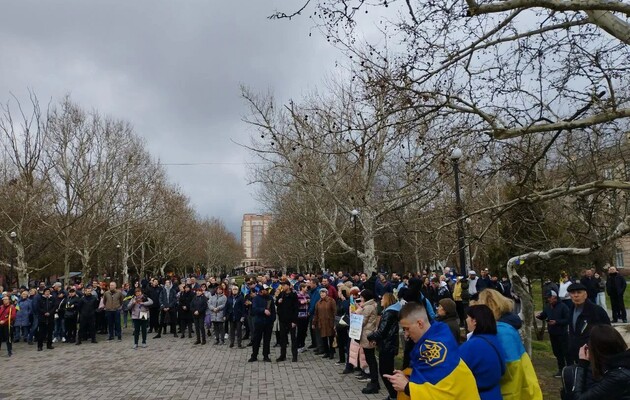 Херсонцы с украинскими флагами и антироссийскими плакатами скандировали: Слава Украине! Героям слава!, Вместе нас много – нас не преодолеть!, Слава воинам ВСУ!, Николаев! Мы с тобой! и другие лозунги.