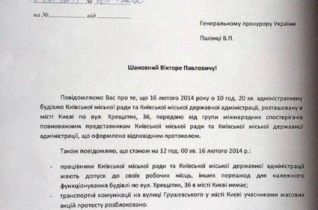 "Уведомляем вас о том, что 16 февраля в 10.20 административные здания КГГА и Киевсовета переданы от группы международных наблюдателей полномочным представителям Киевского городского совета и Киевской городской государственной администрации, которые оформлены соответствующим протоколом", - говорится в сообщении.