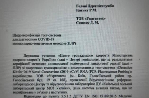 "По результатам верификации методики одношаговой полимеразной цепной реакции с обратной транскрипцией с использованием тест-системы "Detection Kit for 2019 Novel Coronavirus (2019-nCoV) RNA (PCR-Fluorescence Probing)" производства ООО "Укргентех"... данная система признана не верифицированной", - говорится в письме, которое ЦОЗ направил главному санитарному врачу, председателю Гослекслужбы и фирме-производителю.