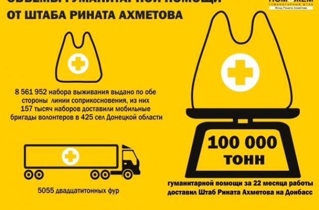 По состоянию на 22 июня 2016 года Гуманитарный штаб Рината Ахметова выдал 8 млн 561 тыс. взрослых и детских наборов выживания по обе стороны линии соприкосновения.