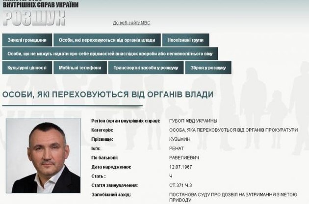 Министерство внутренних дел Украины объявило в розыск бывшего первого заместителя Генерального прокурора Украины, бывшего кандидата в президенты Украины Рената Кузьмина. Соответствующее объявление обнародовано на сайте Министерства внутренних дел Украины (МВД).