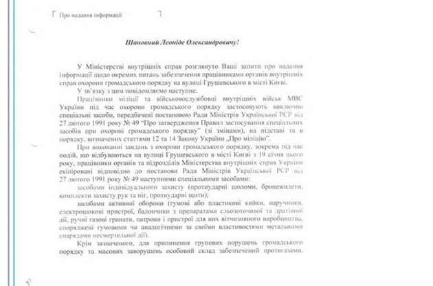 Министерство внутренних дел Украины предоставило официальный перечень спецсредств, которые использовали правоохранители на ул. Грушевского в Киеве. Соответствующее письмо от имени главы МВД Виталия Захарченко было направлено в ответ на запрос народного депутата "Батькивщины" Леонида Емца. Документ обнародован на его странице в Facebook.