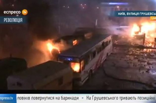Возле стадиона "Динамо" митингующие жгут спецтехнику и автобусы, которые мешают проходу на Грушевского.