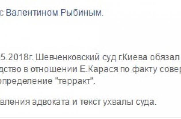 "Сегодня утром 18.05.2018г. Шевченковский суд г.Киева обязал возбудить уголовное производство в отношении Е.Карася по факту совершения действий, подпадающих под определение "теракт ", - говорится в сообщении.