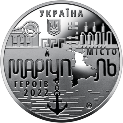 "В написании слова "Мариуполь" букву "i" заменяет свеча как символ памяти по погибшим, а буква "о" имитирует карту города, созданную из двух профилей – детского и взрослого, как символ принудительной депортации. Внизу на фоне стилизованных волн изображено якорь - один из геральдических элементов, который находится на гербе Мариуполя. Это образ надежды на освобождение и возрождение украинского города", - сообщили в Национальном банке.