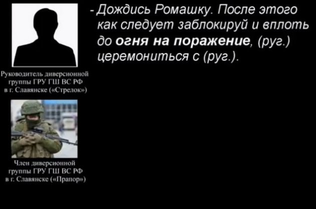 Напомним, ранее в СБУ по результатам перехвата переговоров российских диверсантов и допроса одного из украинских десантников сообщала, что в середине апреля "Ромашка" требовал от украинских военных отказаться от исполнения военных обязанностей. Кроме того, "Ромашка" получал задания от "Стрелка", как разоруживать украинских военных и как в случае чего "стрелять в них на поражение".