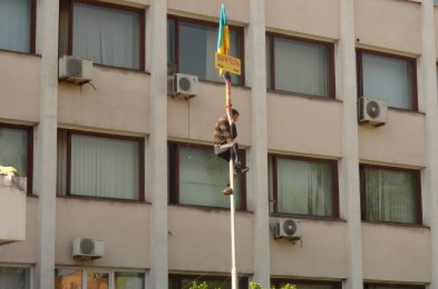 С флагштока возле здания городского совета в 3 Донецкой области был сброшен флаг Украины, который утром в среду в 8.30 водрузили сторонники единой Украины.