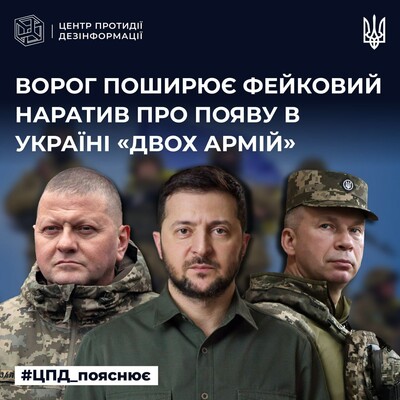 Центр противодействия дезинформации при СНБО сообщает об очередной дезинформационной кампании россиян, которая в этот раз будет состоять в распространении фейков о якобы появлении в Украине "двух армий", одной под командованием главкома ВСУ Валерия Залужного, а другой - под руководством командующего Сухопутными войсками Александра Сырского.