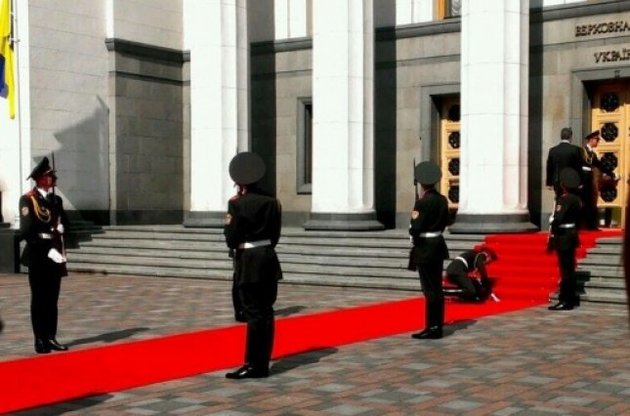 Перед началом церемонии инаугурации, когда около 10:10 Петро Порошенко прибыл в Верховную раду, во время его прохода по красной дорожке к дверям Рады, у одного из солдатов роты почетного караула упало ружье, солдат покачнулся и чуть не упал сам.