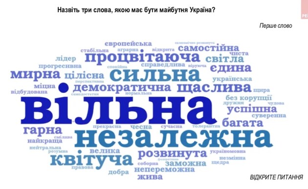 Опрошенным также предложили назвать три слова, которыми они видят будущую Украину. Первым словом чаще всего была «свободна». Вторым признаком для характеристики будущего Украины опрошенные чаще всего использовали «независимая». Третьим признаком – «богатая». Также среди первых слов часто звучали «сильная», «цветущая», «процветающая», «мирная», «счастливая». Также использовали такие характеристики как «европейская», «развитая», «единая».