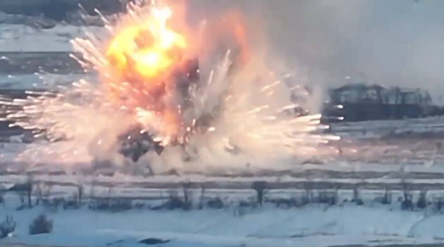 Сначала систему, обнаруженную среди заснеженных украинских полей, подбили. Лишь спустя некоторое время, что хорошо видно на видео, она сдетонировала и взорвалась, образовав "гриб".