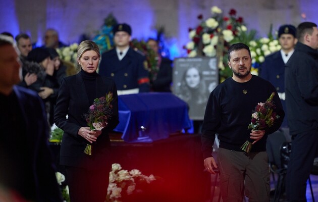 Президент Украины Владимир Зеленский и первая леди Елена Зеленская приняли участие в церемонии прощания с руководством МВД, которое трагически погибло 18 января при крушении вертолета в Броварах.