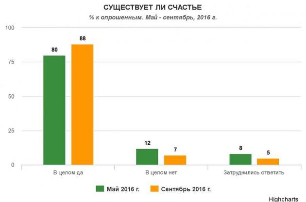 В частности, число респондентов, считающих, что счастье существует, увеличилось на Западе Украины с 79% до 91%, на Востоке – с 73% до 84%, в Центре – с 86% до 91% и на Юге – с 81% до 84%.