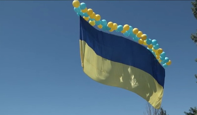 На видео, опубликованном пресс-центром штаба операции Объединенных сил, видно, что флаг полетел с помощью воздушных шариков синего и желтого цвета.