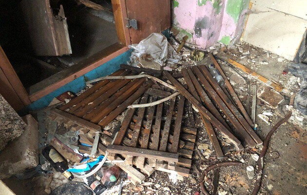 На фото видно уничтоженное имущество, вырванную дверь, разрушенные стены и даже вырванное покрытие пола.