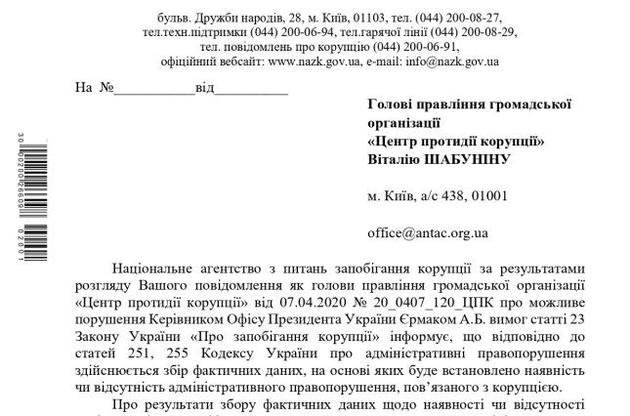 О проверке НАПК сообщили в ответе на запрос Центра противодействия коррупции.