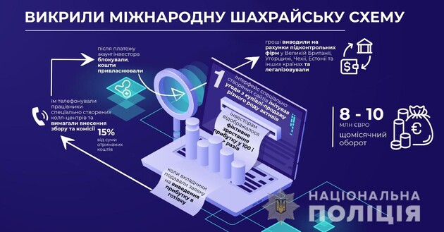 Нацполиция совместно с Офисом генпрокурора и немецкими коллегами разоблачили международную мошенническую «схему» с ежемесячным оборотом в 10 миллионов евро. Большинство пострадавших  жители Германии, Австрии, Швейцарии и Великобритании. сообщили в полиции.