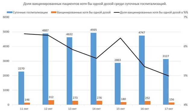 «Данные доступны только с 11 октября, имеем для расчета всего 8 дней. За 8 дней было госпитализировано 27461 пациент, из них 1595 пациент были вакцинированы хотя бы одной дозой (5,8%). С учетом числа вакцинированных граждан 1 дозой 7,9 млн, и численности населения 38 млн имеем 21% вакцинированного населения первой дозой. Таким образом получается, что вакцинация обеспечила защиту 72%», — написал Истребин.