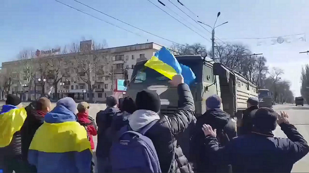 Сотни херсонцев с флагами Украины двинулись на российские военные грузовики, маркированные белой латинской Z. Люди скандировали: «Давай домой!».
