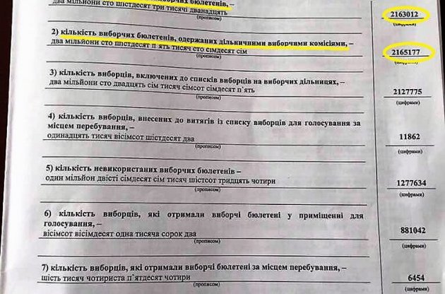 Так, в протоколе о результатах выборов мэра Киева указано, что количество бюллетеней, полученных участковыми комиссиями, составляет 2 166 205 штук, тогда как в количестве изготовленных бюллетеней значится цифра 2 163 012 штук.