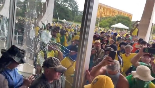 Митингующие штурмовали здание Конгресса Бразилии, также ворвались в Верховный суд и оцепили президентскую резиденцию. Все они одеты в цвета бразильского флага, часть – держали в руках портреты Болсонара.