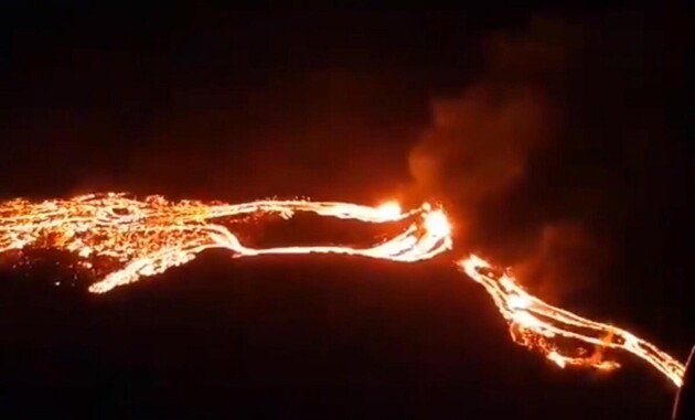 Береговая охрана региона опубликовала видео извержения вулкана Фаградалсфьяль в Исландии: лава растеклась в две стороны от его жерла.