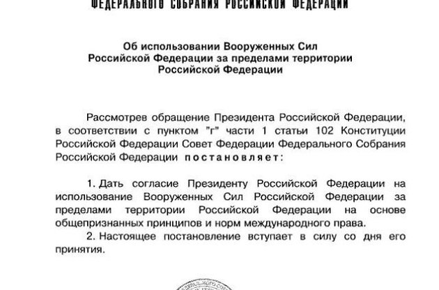 В тексте постановления указывается, что Совет Федерации дает согласие президенту России Владимиру Путину на использование вооруженных сил за пределами территории РФ "на основе общепризнанных принципов и норм международного права".