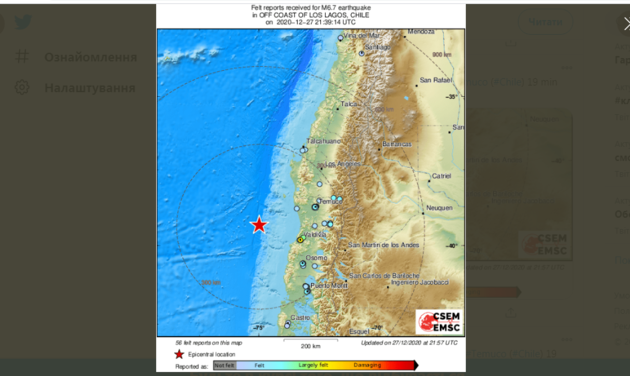 Эпицентр залегал на глубине 10 км и примерно в 163 км от портового города Чили Вальдивии.
