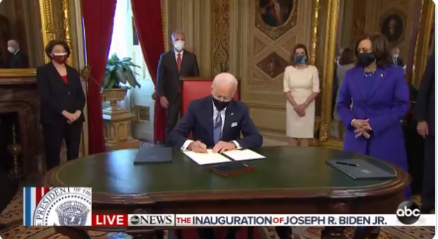 Как сообщает телеканал ABC News, после принятия присяги президента, Байден подписал три документа, находясь в президентской комнате в Капитолии.