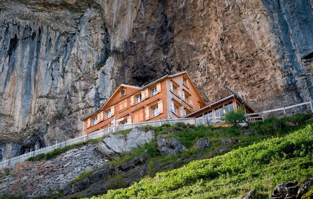 Это долгий и трудный поход или извилистая поездка по канатной дороге (за которой следует более короткий поход) к этой гостинице 19-го века, которая головокружительно примыкает к склону горы Эбенальп в регионе Аппенцелль в Швейцарских Альпах.