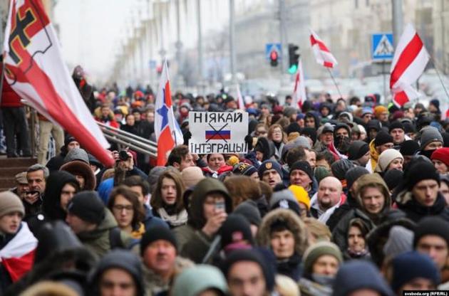 Так, на Октябрьскую площадь вышли сотни человек, которые образовали живую цепь. Они держали плакаты против интеграции с соседней страной и кричали "Живе Беларусь". Правоохранители их не трогали, однако назвали акцию незаконной. Между протестующими и милиционерами произошла небольшая стычка.