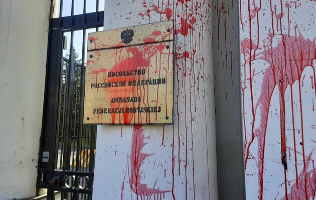 В марте российское посольство в Польше облили красной краской, что символизировало льющуюся в Украине по вине РФ кровь.