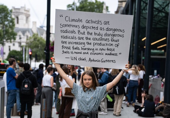 В июле её оштрафовали за отказ покинуть акцию протеста на дороге для транспортировки нефти из порта. После вынесения приговора Тунберг и другие активисты вернулись в порт и их снова увела полиция.