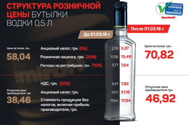 Поднимать цены на свой продукт вынуждены добросовестные производители, которые платят все налоги в госбюджет. Среди них - предприятие ООО "ЛВН Лимитед", специализирующееся на производстве водки и крепких спиртных напитков под маркой Nemiroff, известной уже более чем в 80 странах мира (далее - Nemiroff). В 2015 году общая сумма налогов, уплаченных компанией Nemiroff в госбюджет Украины, составила более 764 млн гривен.