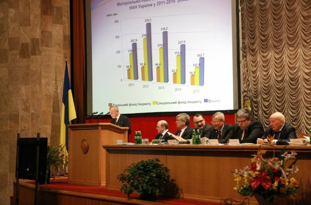 Президент НАН Украины Б.Патон не принимал участия в большом академическом собрании - присутствующим в зале сообщили, что Борис Евгеньевич заболел ("потерял голос"). Традиционный отчетный доклад об итогах деятельности НАН Украины в 2015 г. и основные направления деятельности на перспективу зачитал первый вице-президент академик Антон Наумовец.
