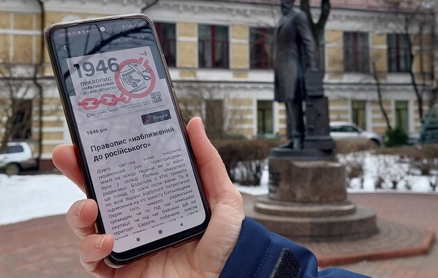 Для этого нужно загрузить приложение и построить маршрут, идя от одной графической таблички к следующей. Размещены они по центру Киева. Наводишь смартфон на QR-код и слушаешь справку на украинском, русском или английском о тех или иных притеснениях соловьиной и связанном с ними запрете на украинские школы, книги, богослужения и т.п.