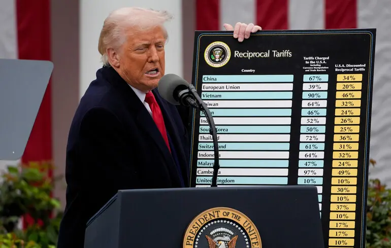 Президент США Дональд Трамп во время пресс-конференции представил таблицу с тарифными ставками для других стран. По его словам, Соединенные Штаты будут рассчитывать тарифную ставку для других стран на основе пошлин и других "форм обмана" (левый столбик представленных таблиц).