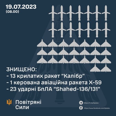 Во время ночной атаки на Украину в ночь на 19 июля российские нападники атаковали объекты критической инфраструктуры и военные объекты, а основное направление удара пришлось по Одесской области. При этом оккупанты использовали крылатые ракеты воздушного, наземного и морского базирования, а также иранские ударные БпЛА типа Shahed-136/131, сообщили в Воздушных силах ВСУ.