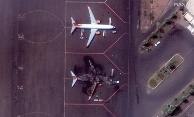 Спутник Maxar зафиксировал, как выглядит сгоревший украинский самолет SkyUp Boeing 737 в аэропорту столицы Хартумы в охваченном переворотом Судане. The New York Times сообщает об идентификации двух десятков уничтоженных самолетов. Среди них – борт украинской авиакомпании.